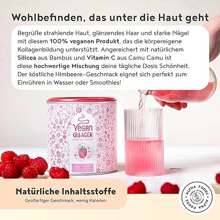 Für weitere Informationen über das vegane Kollagenpulver von Alpha Foods und um dein eigenes zu bestellen, besuche bitte diesen Link: Alpha Foods Vegan Collagen Formation Support mit Hyaluronsäure, Vitamin C aus Camu- und Silicea - Pflanzliche Alternative zu konventionellem Pulver - für Haut, Haare, Nägel - Himbeere - 400g Kollagen